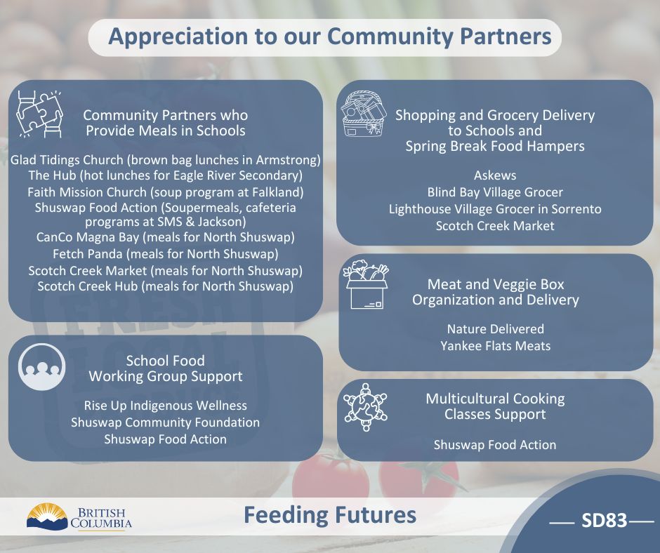 In SD83, Serena Caner, a registered dietician, serves as the Feeding Futures Program Coordinator, overseeing breakfast and “top up” snack programs that are available free of charge for students in the District. These programs offer nutritious options such as fruits, vegetables, and proteins, with a focus on purchasing local and BC-grown foods whenever possible.