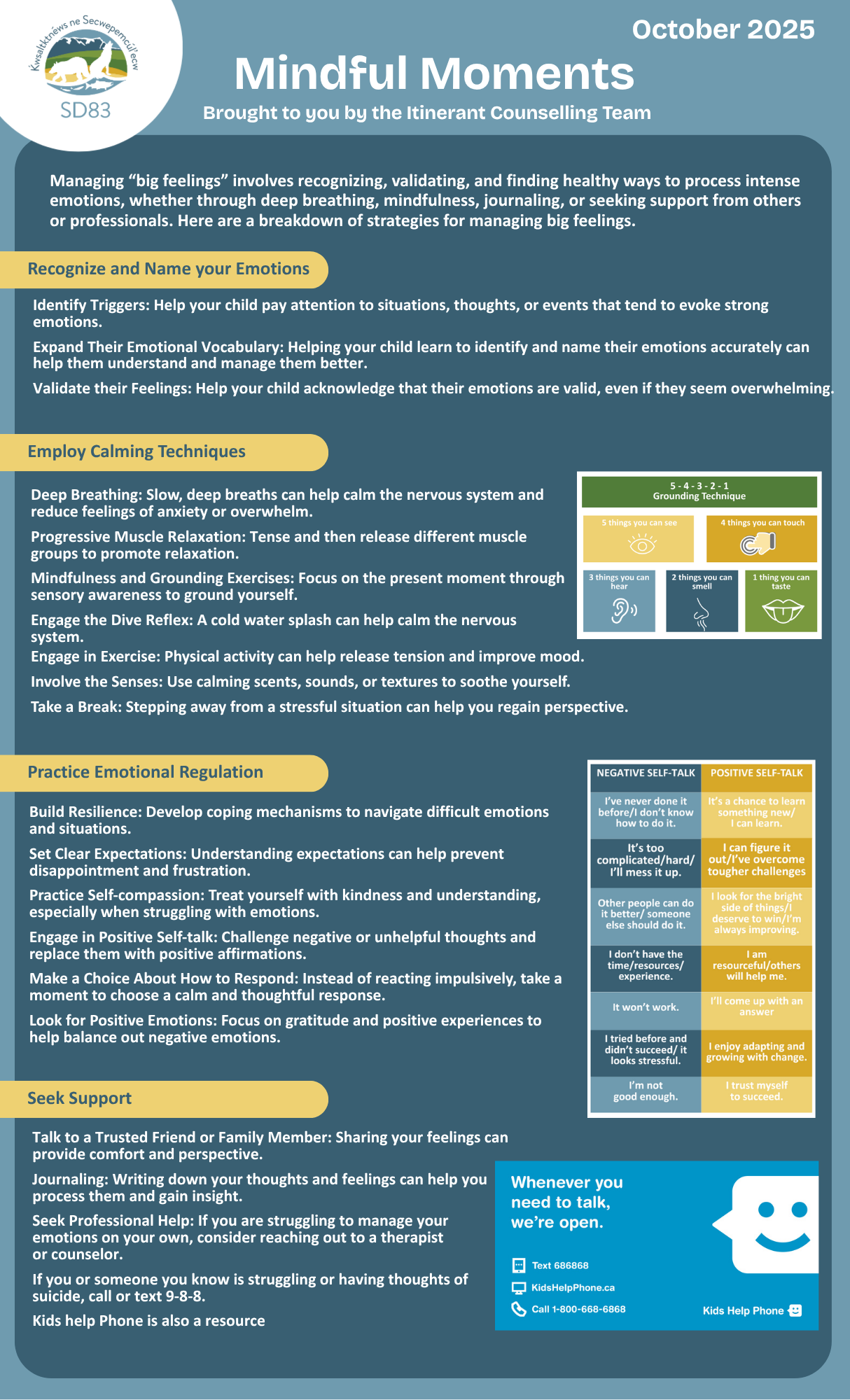 Welcome to Student Support Services “Monthly Mindful Moments” designed just for parents/guardians by the District Itinerant Counselling Team! Each monthly theme will explore strategies and resources for fostering children’s resilience and nurturing their social emotional well-being.